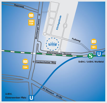 The connection is extraordinarily well. A metro station (underground and city railway), bus routes and major road connections leading to all Berlin districts are near by. Patients and visitors can use the spacious parking area east of the doorway in front of the hospital site.